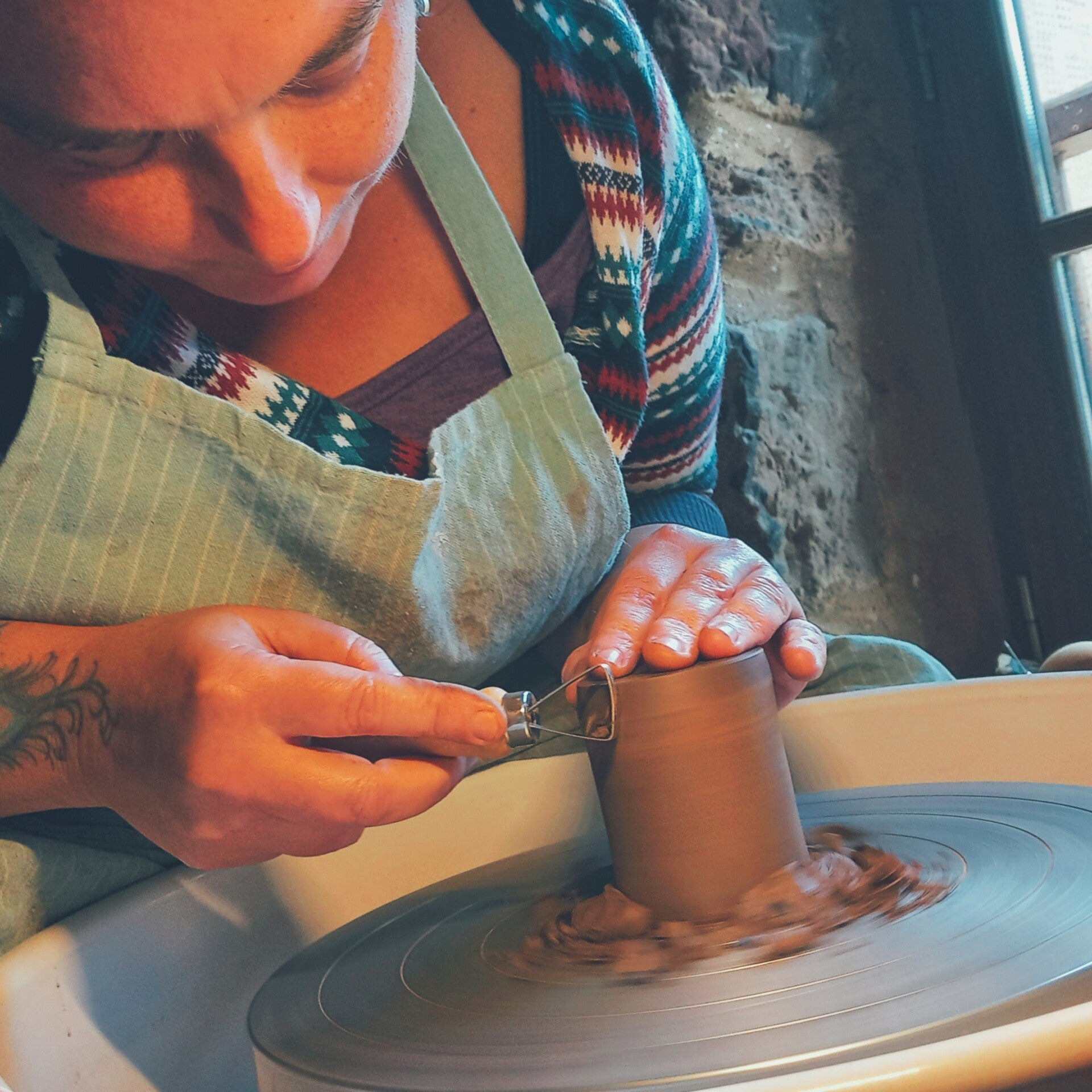 Je transmets ma passion de la terre à travers des cours de tournage, en basant ma pratique sur le calme et le centrage de soi avant tout, afin d’entrer en lien avec l’argile et qu’ainsi le processus ne soit pas seulement de fabriquer un objet, mais aussi de se nourrir intérieurement.